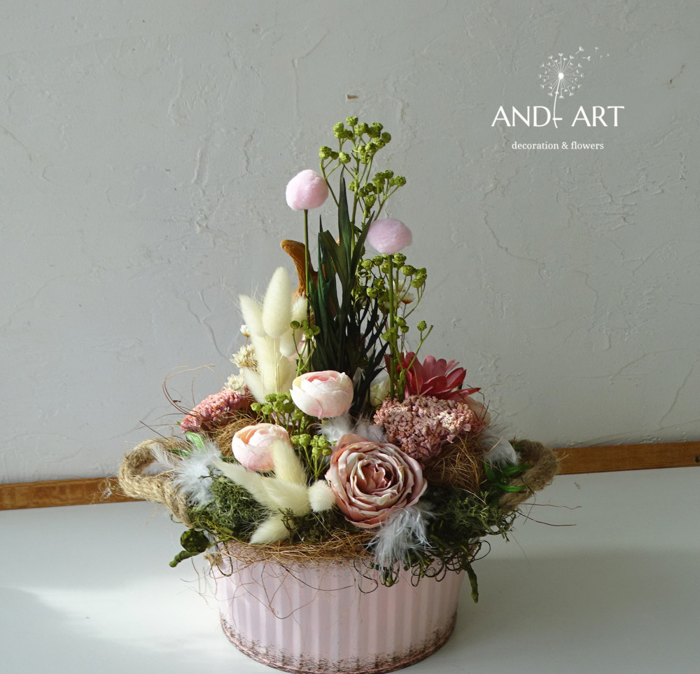 Blechgefäß, Keramik, Seidenblumen, Trockenblumen, Früchte, Künstliche Wachteleier
