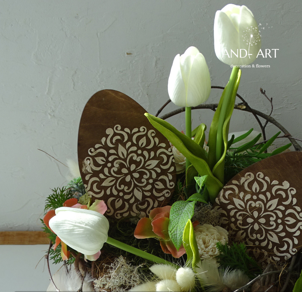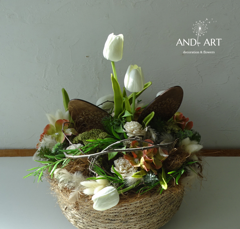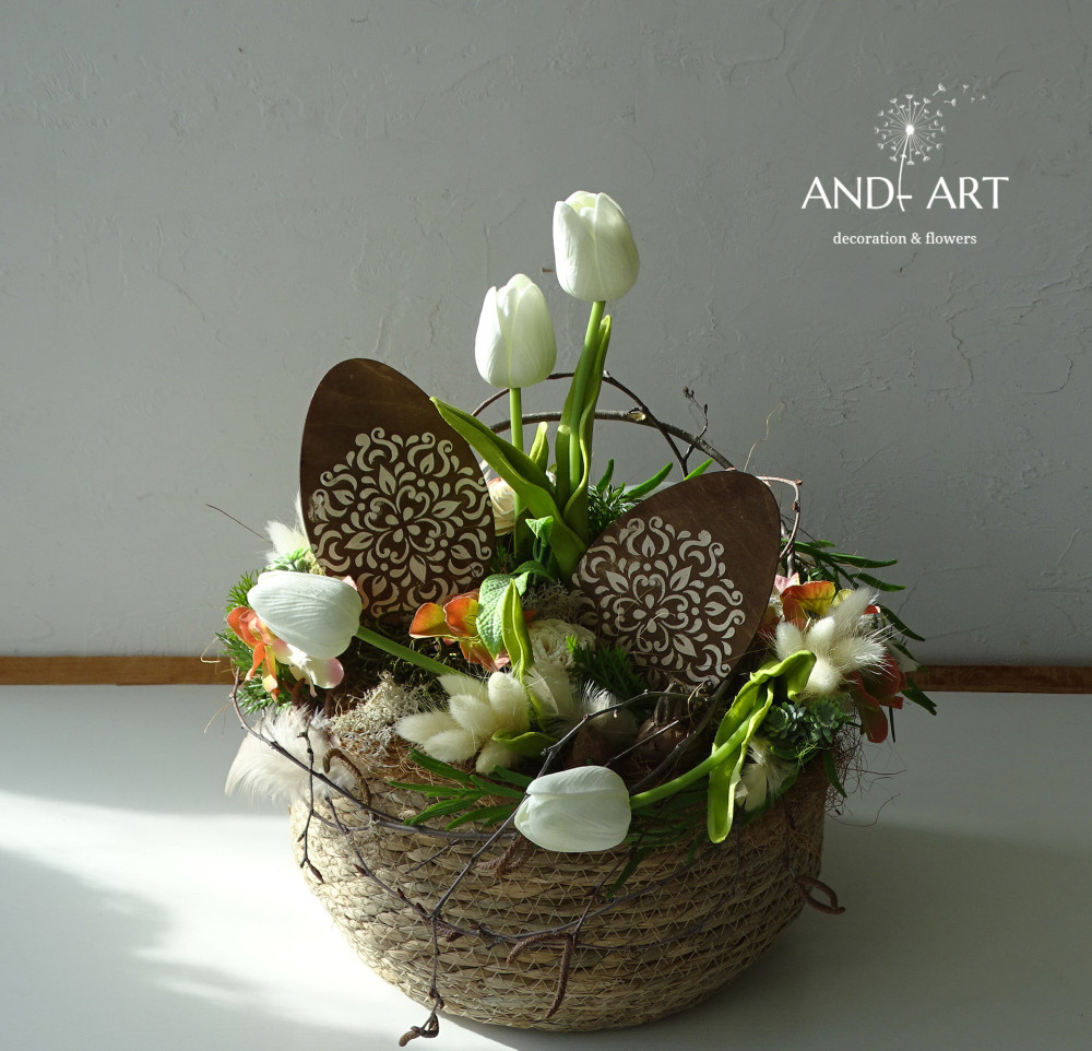 Weidenkorb, Polifoam-Tulpe, Holzei, Seidenblumen, Trockenblumen