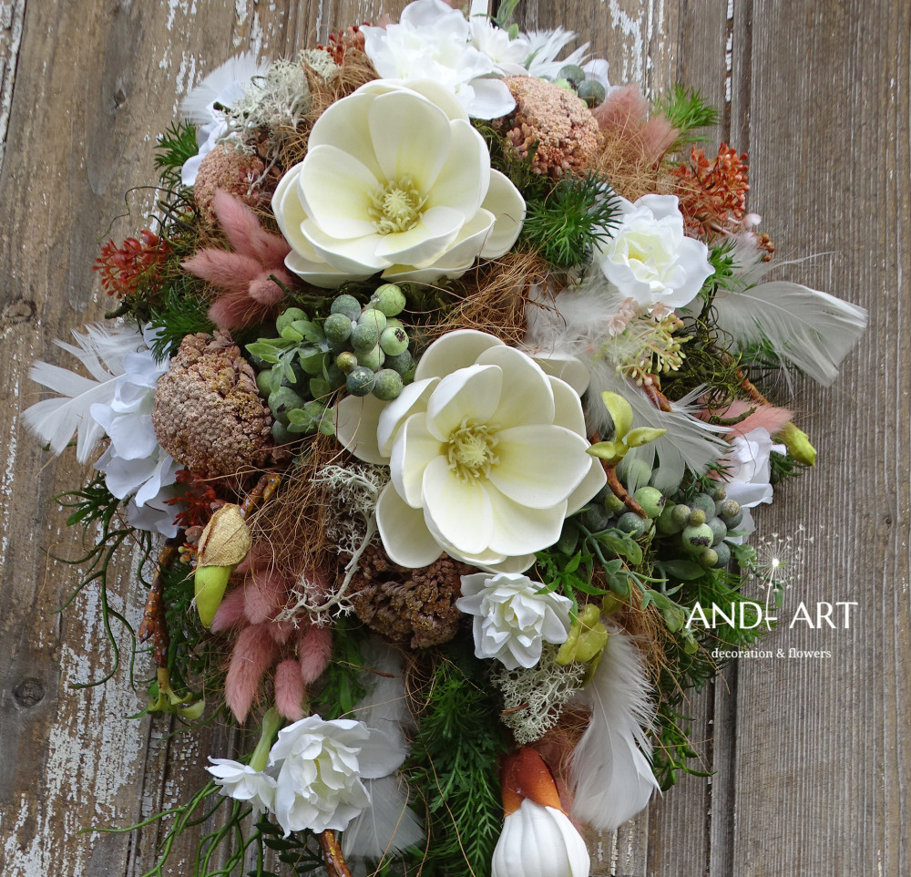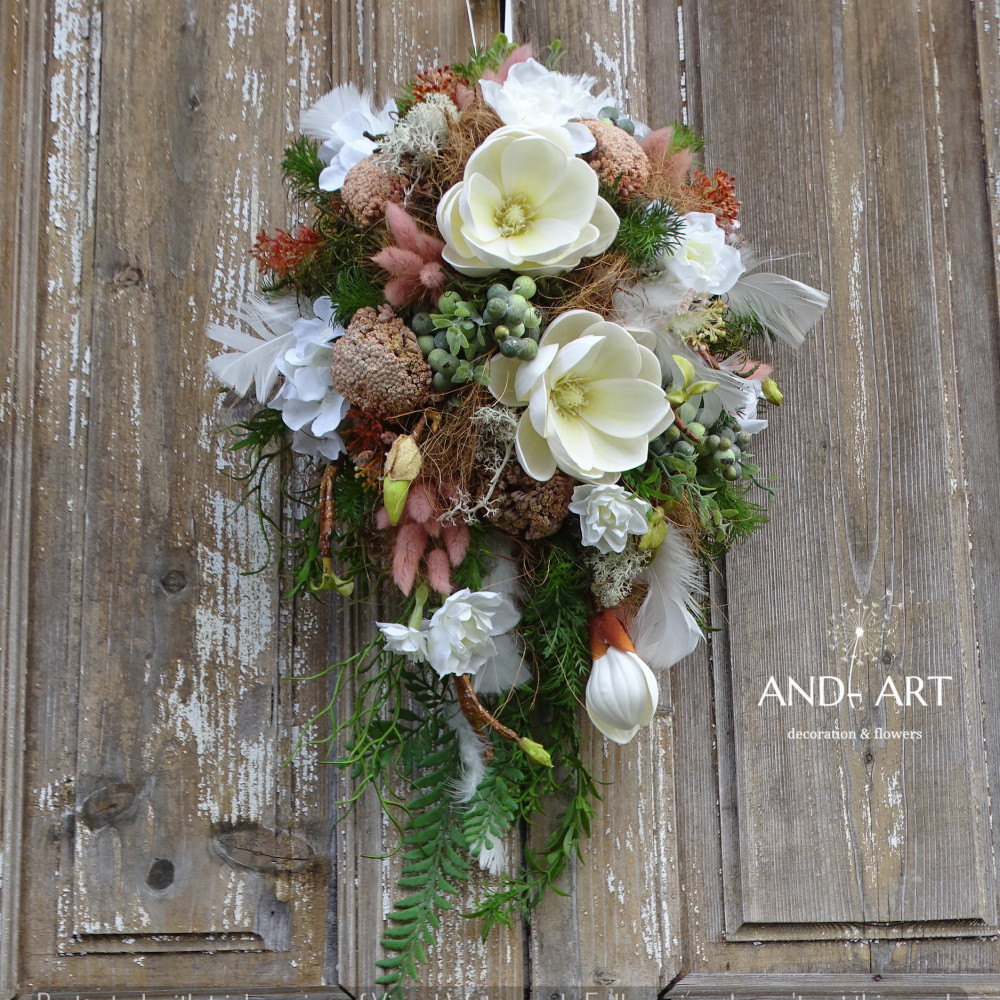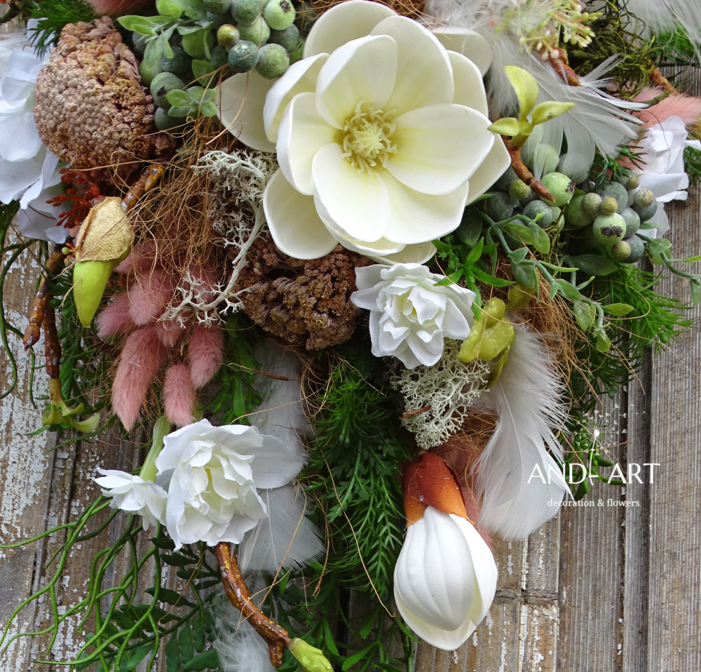 Holz, Mattlack, Seidenblumen, Premium Magnolie, Trockenblumen, Realistisches Grün